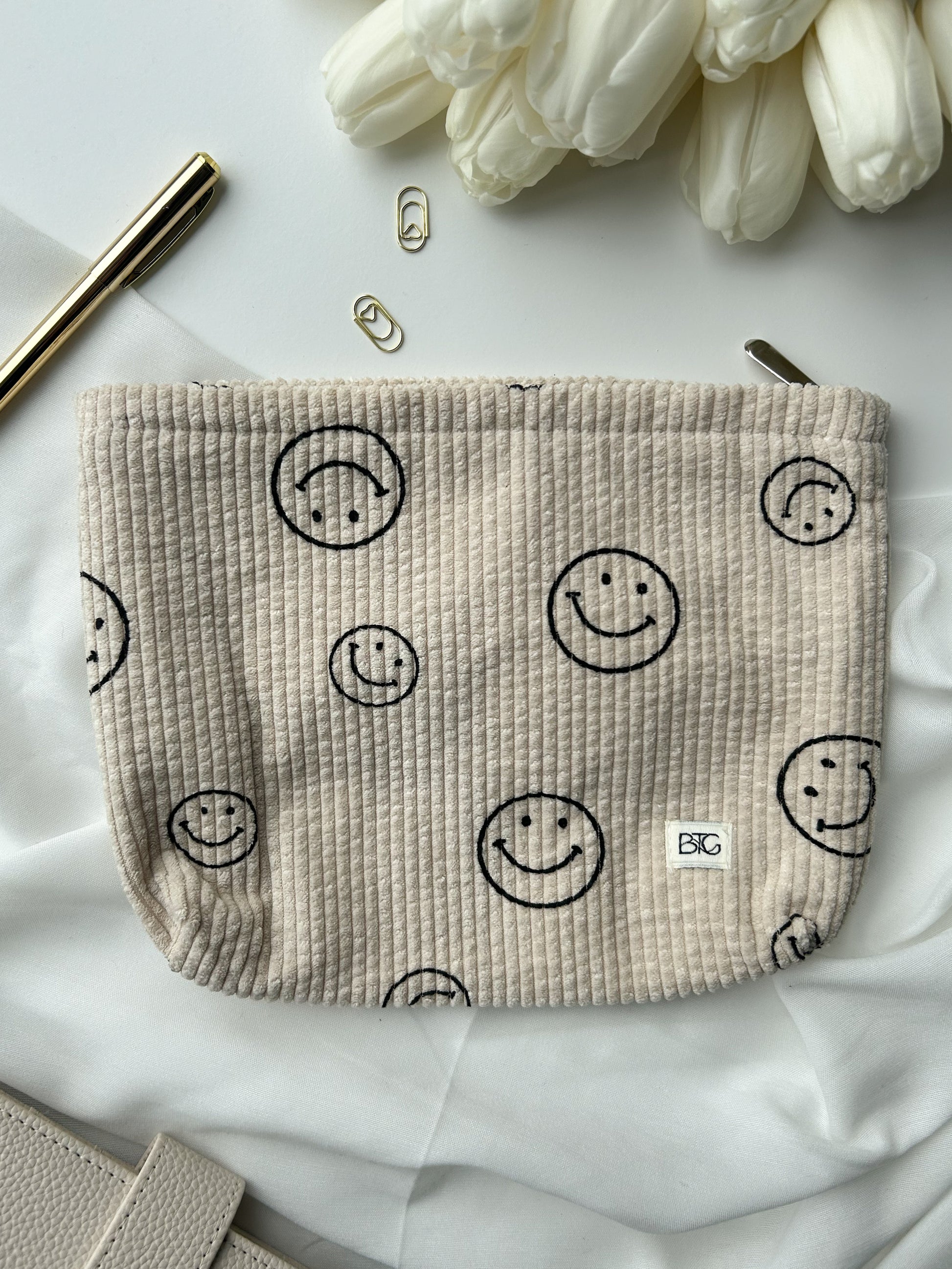Der Cordbeutel mit einem fröhlichen Smiley-Print bietet eine sichere und stilvolle Möglichkeit, deine Gegenstände aufzubewahren und ist somit ideal für den täglichen Gebrauch geeignet. Durch den silbernen Reißverschluss lässt sich die Tasche einfach öffnen und bei Bedarf schonend per Hand waschen.