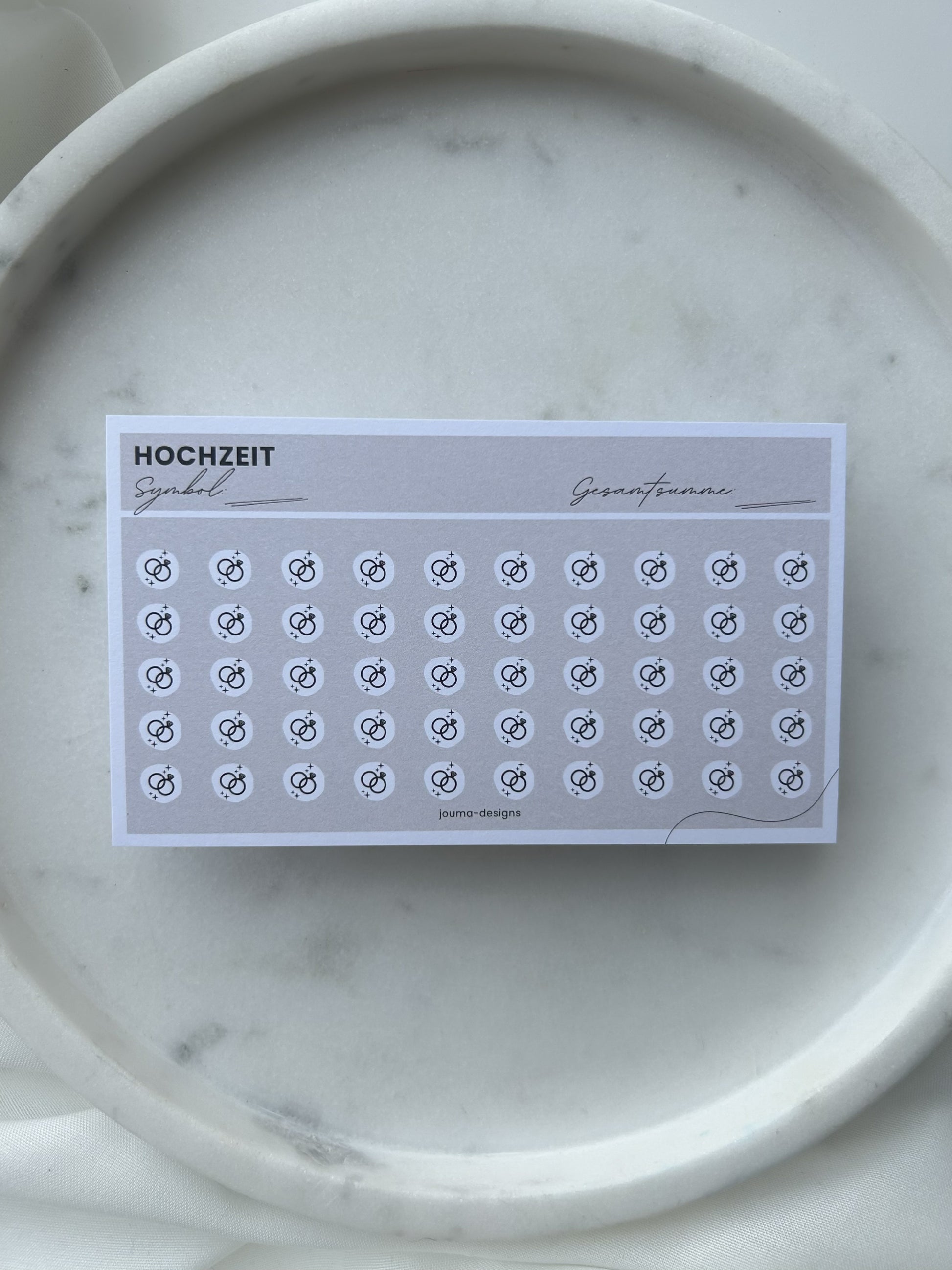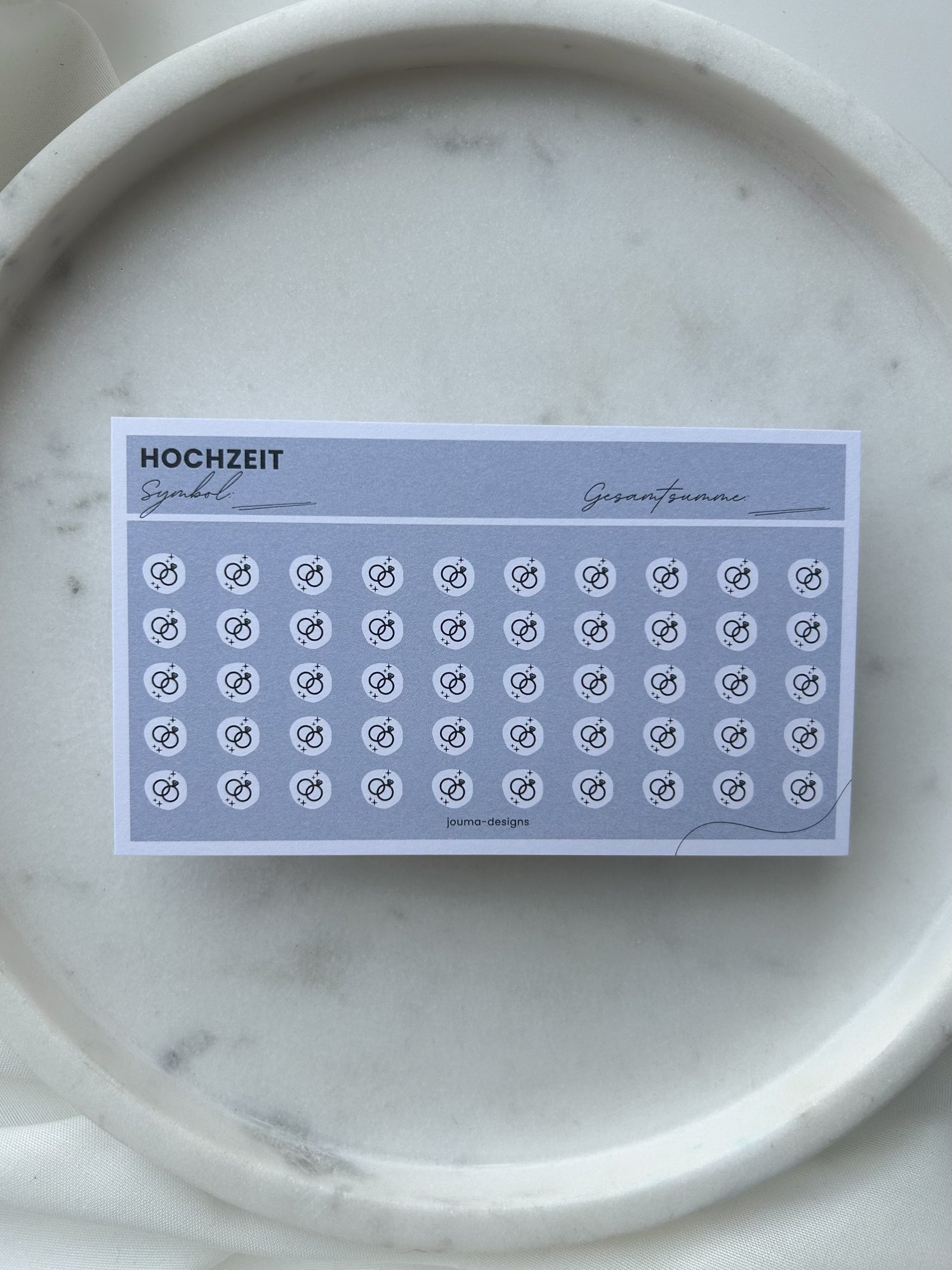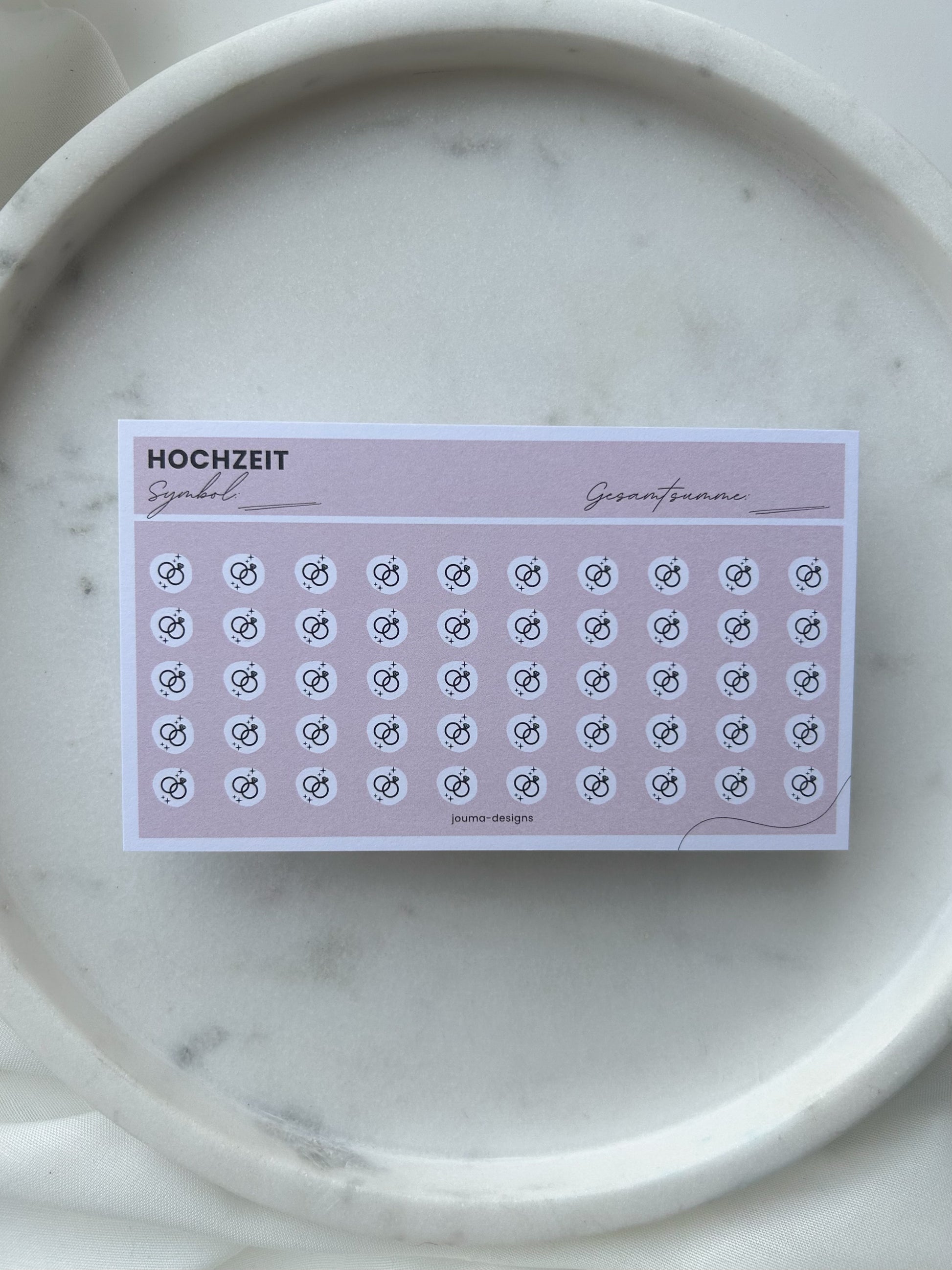 Dank der speziell für diesen Zweck entworfenen Vorlage kannst du auf einfache Weise deine gewünschte Summe für deine Traumhochzeit zurücklegen. Einfach Wunschsumme festlegen, Betrag pro Symbol berechnen und jeden gesparten Euro mit einem symbolischen Streich auf der Vorlage vermerken.