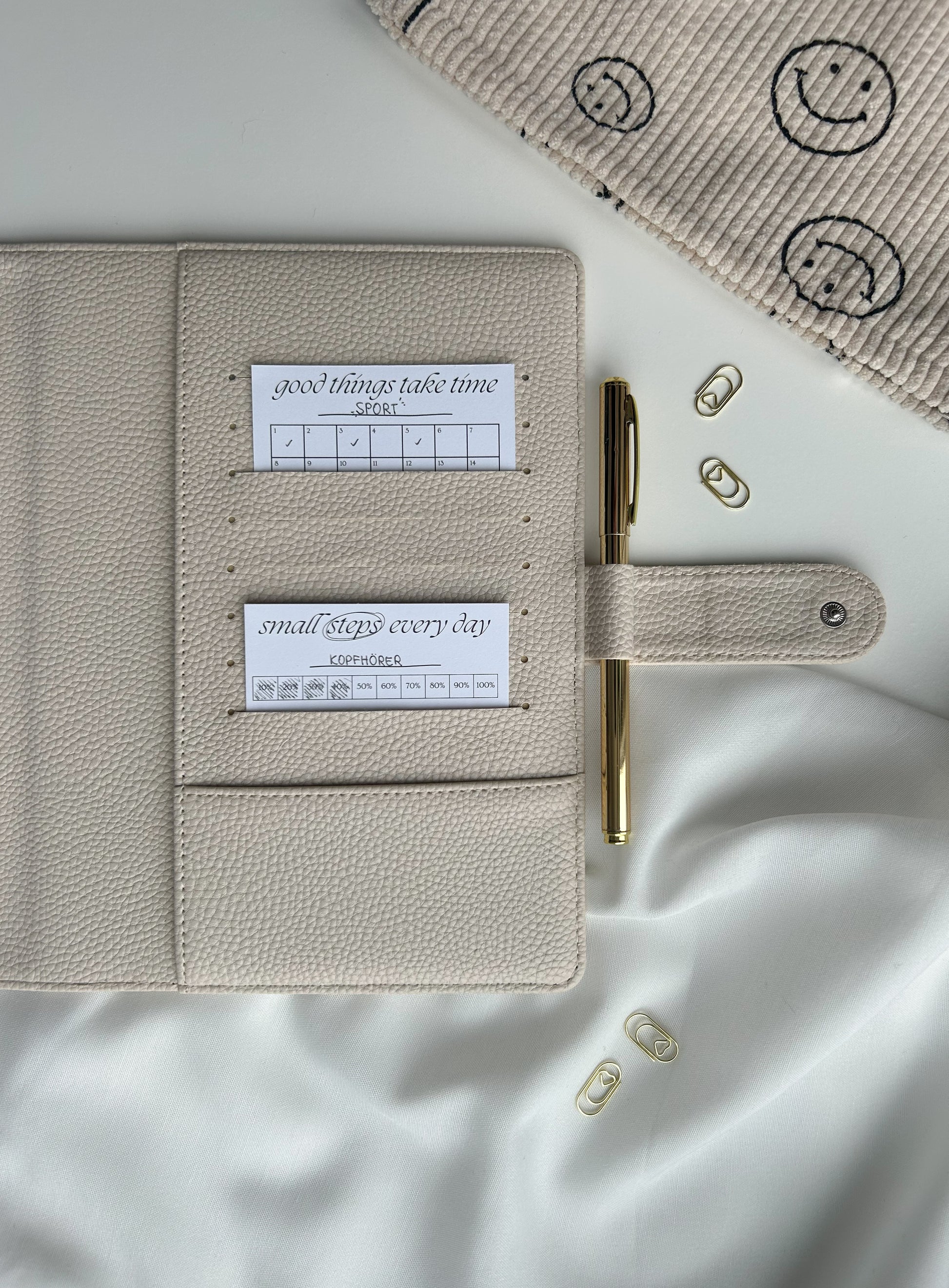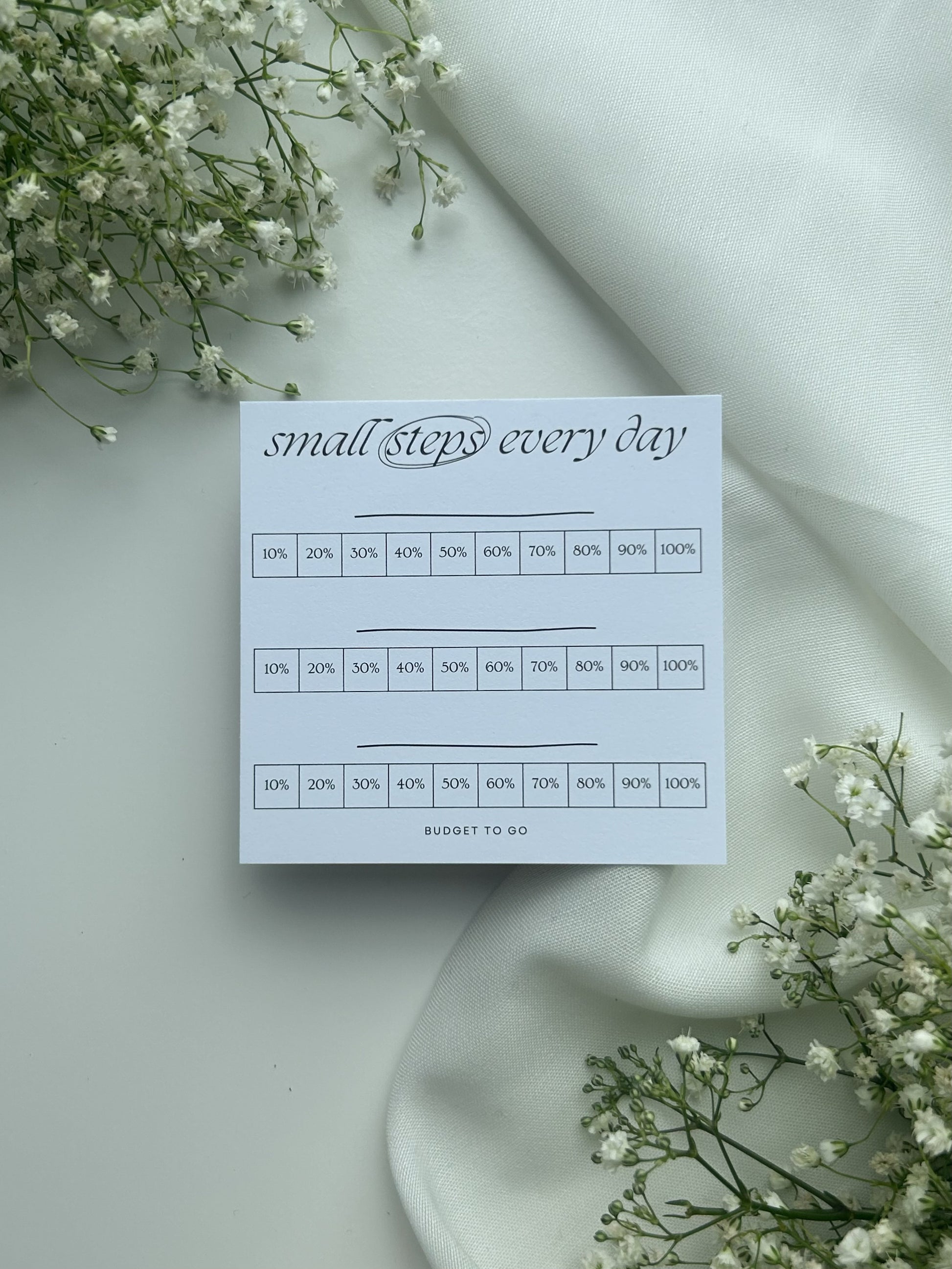 Mit unserer hochwertigen Zielvorlage behältst du stets den Überblick über deine finanziellen Ziele. Die doppelseitig bedruckte Vorlage bietet Platz für bis zu sechs individuelle Sparziele, die mit Leichtigkeit verfolgt werden können. Durch die inspirierenden Sprüche auf den Seiten und die übersichtliche Prozentskala behältst du stets den Fortschritt im Blick. Mit einer handlichen Größe von 8,3 x 8 cm passt die Vorlage perfekt in deine Binder und Umschläge.