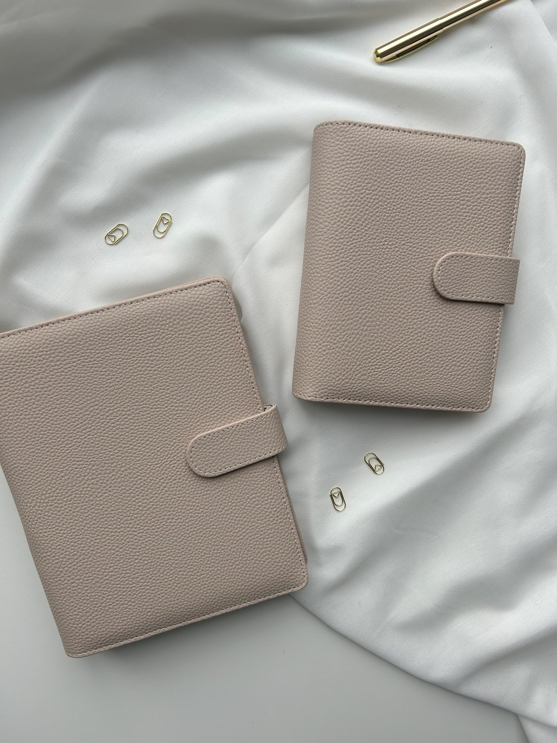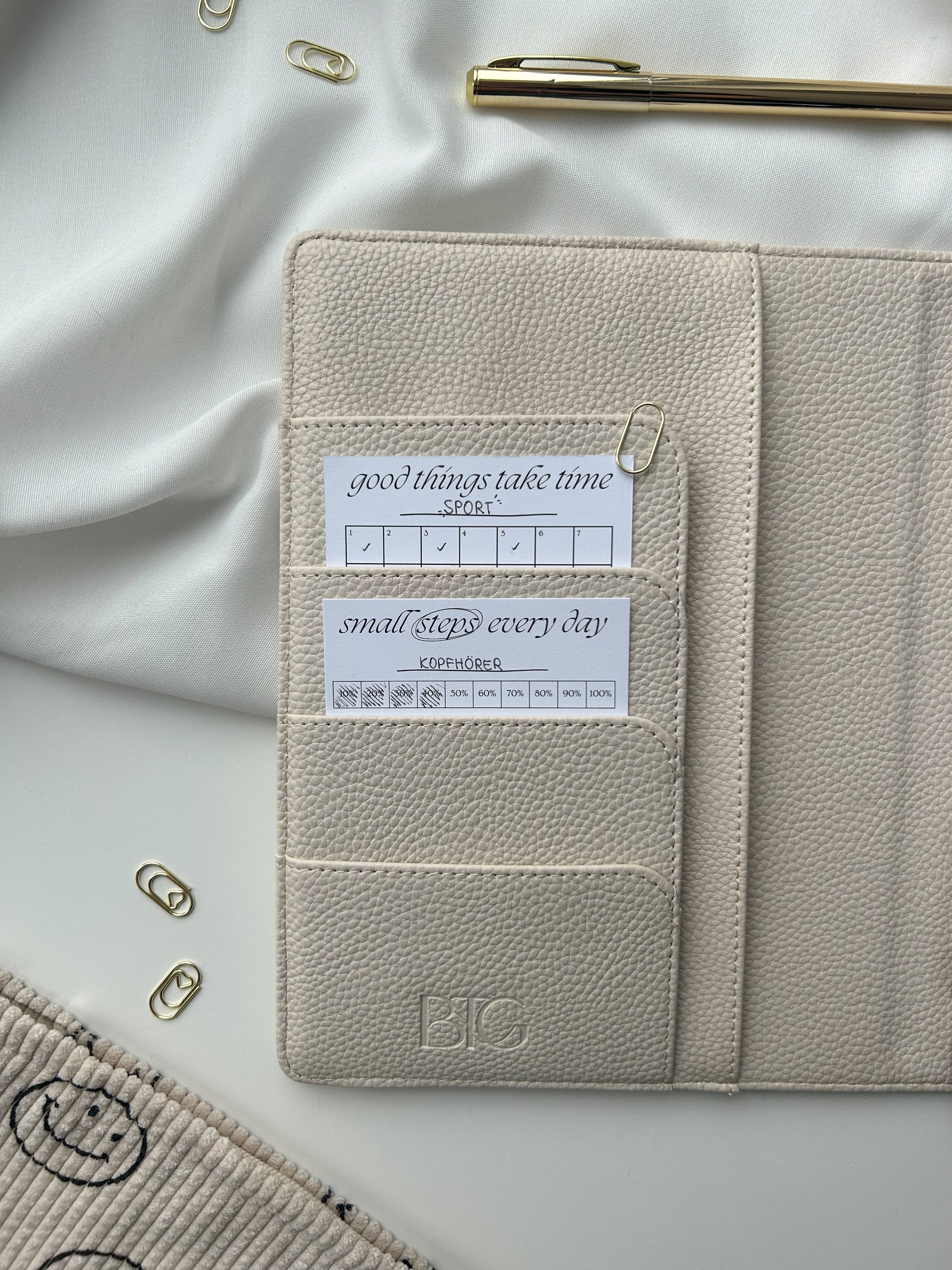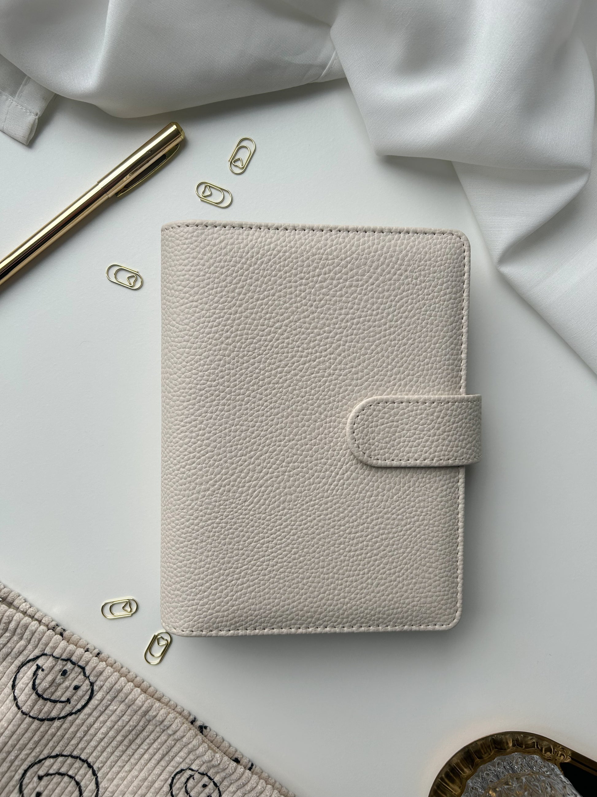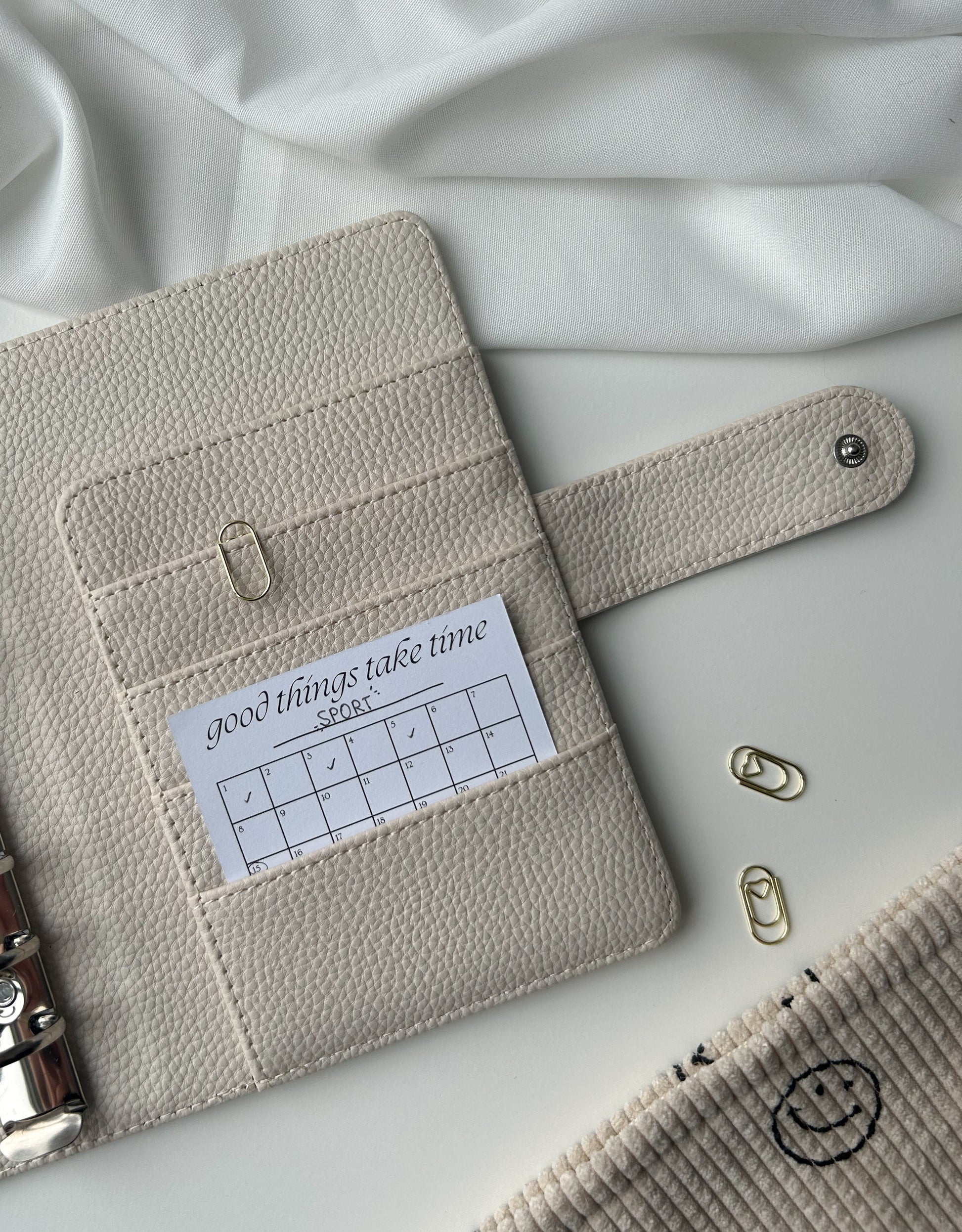 Der Binder aus weichem Lederimitat eignet sich für Budgetplaner und Umschläge in A5. Er verfügt über drei Kartenfächer und zwei Einschüben auf der linken Innenseite und hat einen silbernen Ringeinsatz mit sechs Ringen. Auf der rechten Innenseite befinden sich acht Kartenfächer und zwei weitere Einschübe, sowie eine Stifthalterung. Der Binder lässt sich mithilfe eines Druckknopfes sanft verschließen. Der Binder hat Außenmaße von 23,5 x 19 cm und ist ohne tierischen Bestandteile gefertigt. Du hast die Wahl zwischen unserem wunderschönen light beige (helle Farbe) und beige.